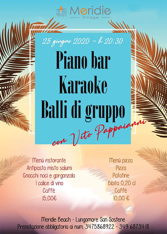 Ti aspettiamo giovedì 25 giugno presso il Meridie Beach dalle ore 20:30, serata piano bar con karaoke e balli di gruppo insieme a Vito Pappaianni.